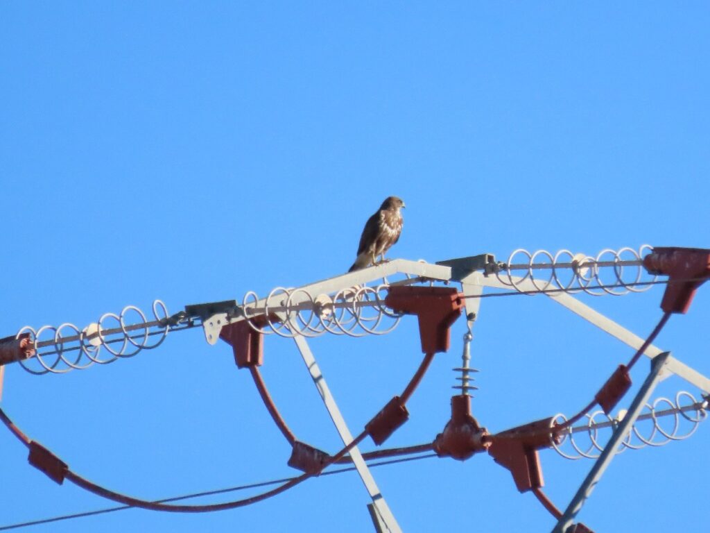 Busardo ratonero posado en un tendido corregido mediante preformados. Fotografía: Jorge Ortiz. AUDEMA.